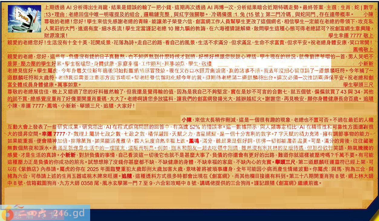 〖追隨〗:這種透料方式很多時都會出現在《創富網》,而其他欄目接連有料到。第三十八期開重肖狗8號,網上林大師中8號、信箱截圖狗肖、九方大師0358尾、風水玄學第一門7至9、六合彩攻略中8號、講碼佬提供的三合狗肖。謹記跟隨《創富網》繼續前進。