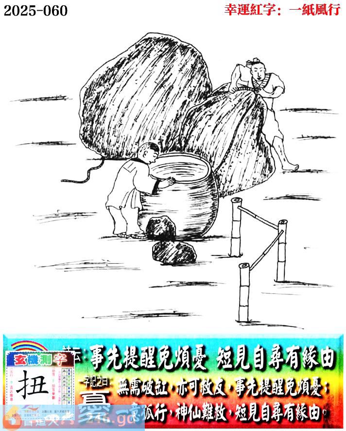 060期老版跑狗一字記之曰:【憂】 詩雲:事先提醒免煩憂,短見自尋有緣由。 無需破缸,亦可救友,事先提醒免煩憂; 一意孤行,神仙難救,短見自尋有緣由。 玄機測字:《扭》
