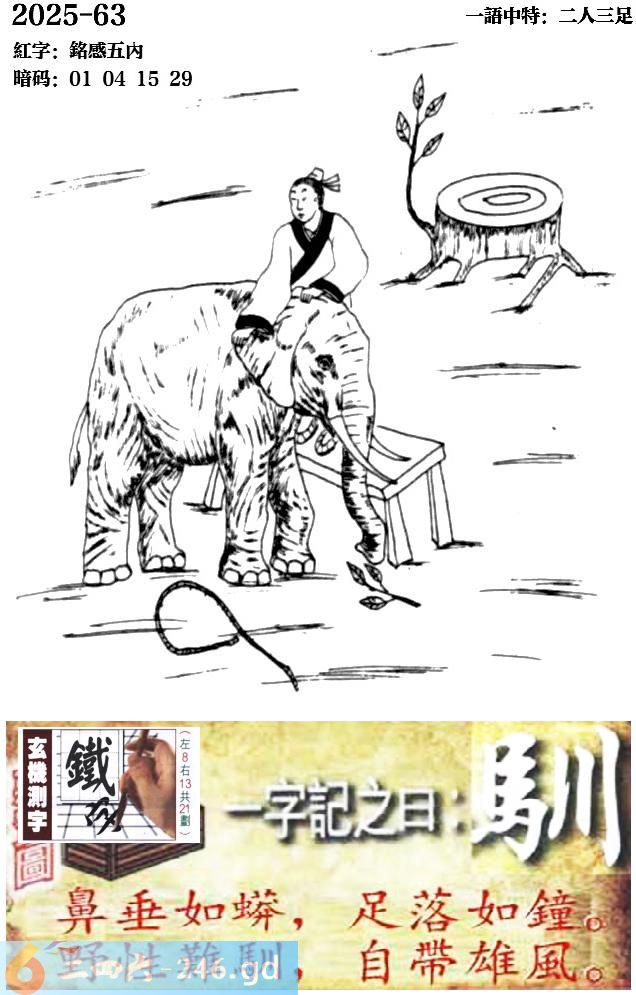 063期跑狗一字記之曰:【馴】 鼻垂如蟒,足落如鐘。 野性難馴,自帶雄風。 玄機測字:《鐵》 一語中特:二人三足
