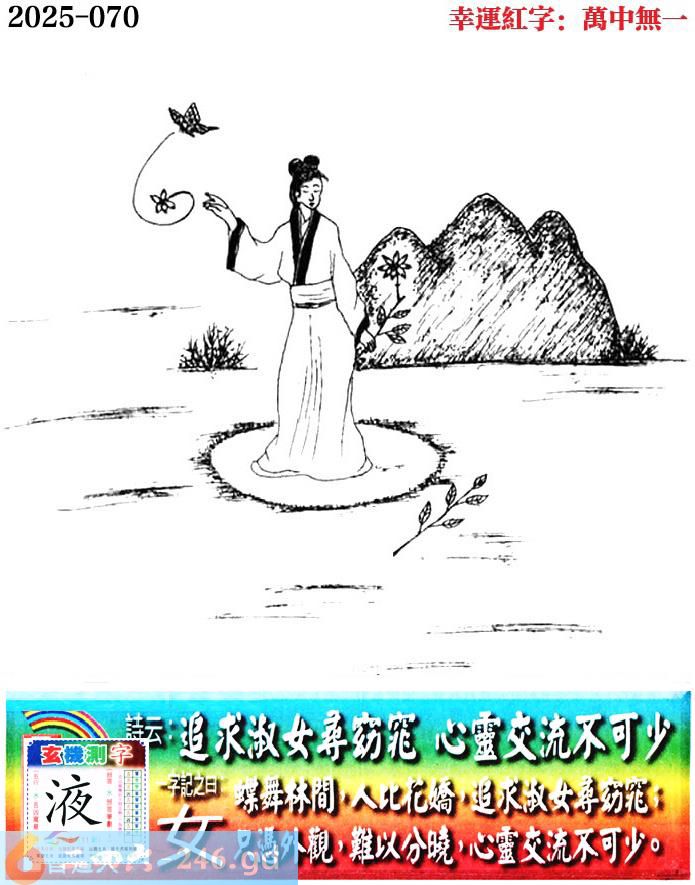 070期老版跑狗一字記之曰:【女】 詩雲:追求淑女尋窈窕,心靈交流不可少。 蝶舞林間,人比花嬌,追求淑女尋窈窕; 只憑外觀,難以分曉,心靈交流不可少。 玄機測字:《液》