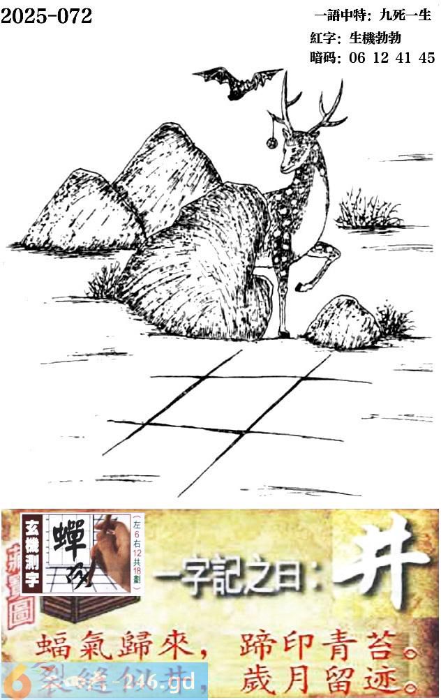 072期跑狗一字記之曰:【井】 蝠氣歸來,蹄印青苔。 裂縫似井,歲月留跡。 玄機測字:《蟬》 一語中特:九死一生