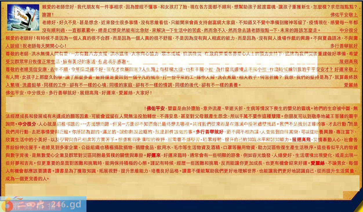 【5】.尊敬的老總見信安康,去年不順!今年還是運不好,現在才换藥回家?人生路上有桃梯大道,也有羊腸小徑,為什麼我連續走羊腸小徑,什麼時候輪到我的平平安安才?好運來敬上