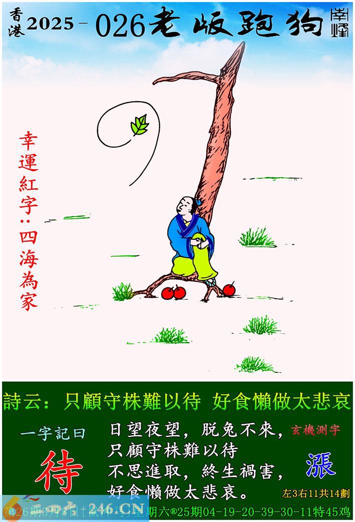 026期老版跑狗一字記之曰:【待】 詩雲:只顧守株難以待,好食懶做太悲哀。