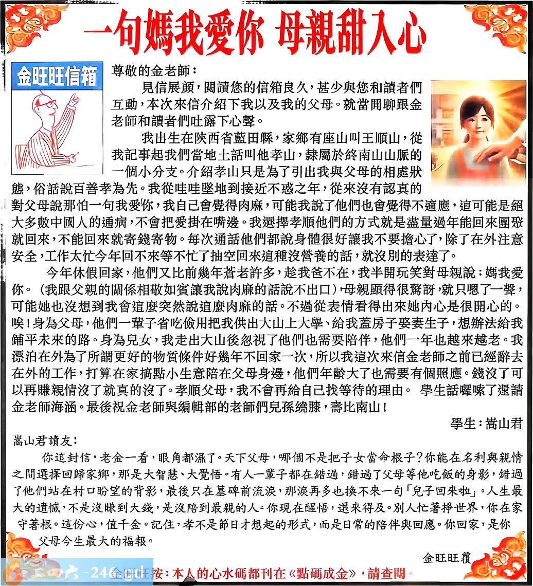 100期:金旺旺信箱彩民推荐→→《一句媽我愛你 母親甜入心》