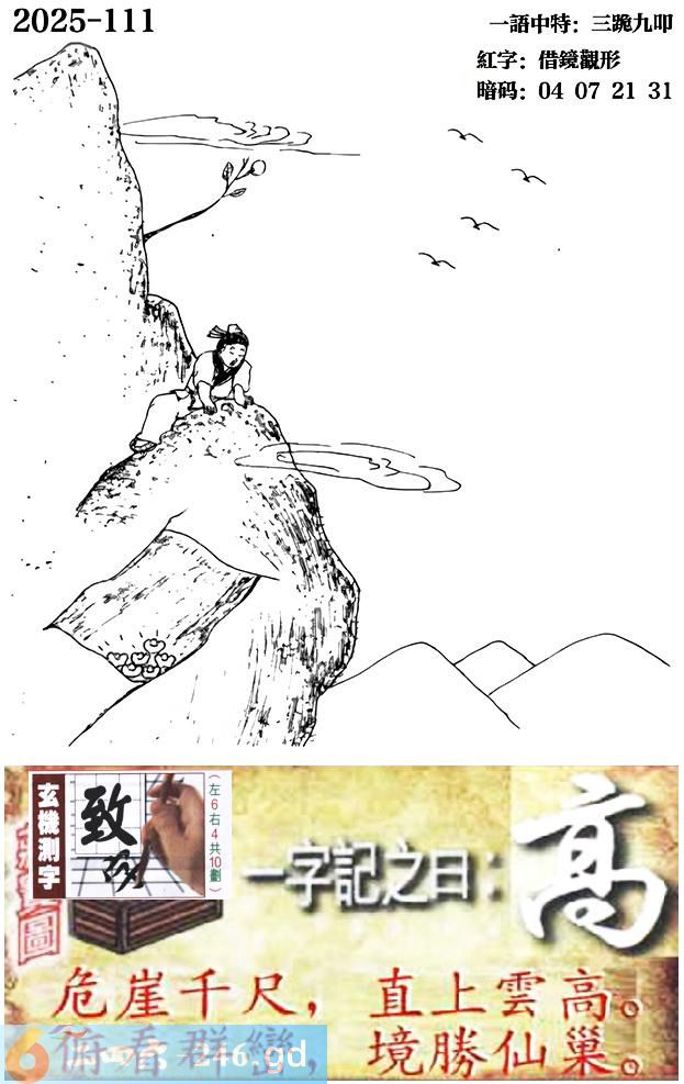111期跑狗一字記之曰:【高】 危崖千尺,直上雲高。 俯看群巒,境勝仙巢。 玄機測字:【致】 一語中特:三跪九叩