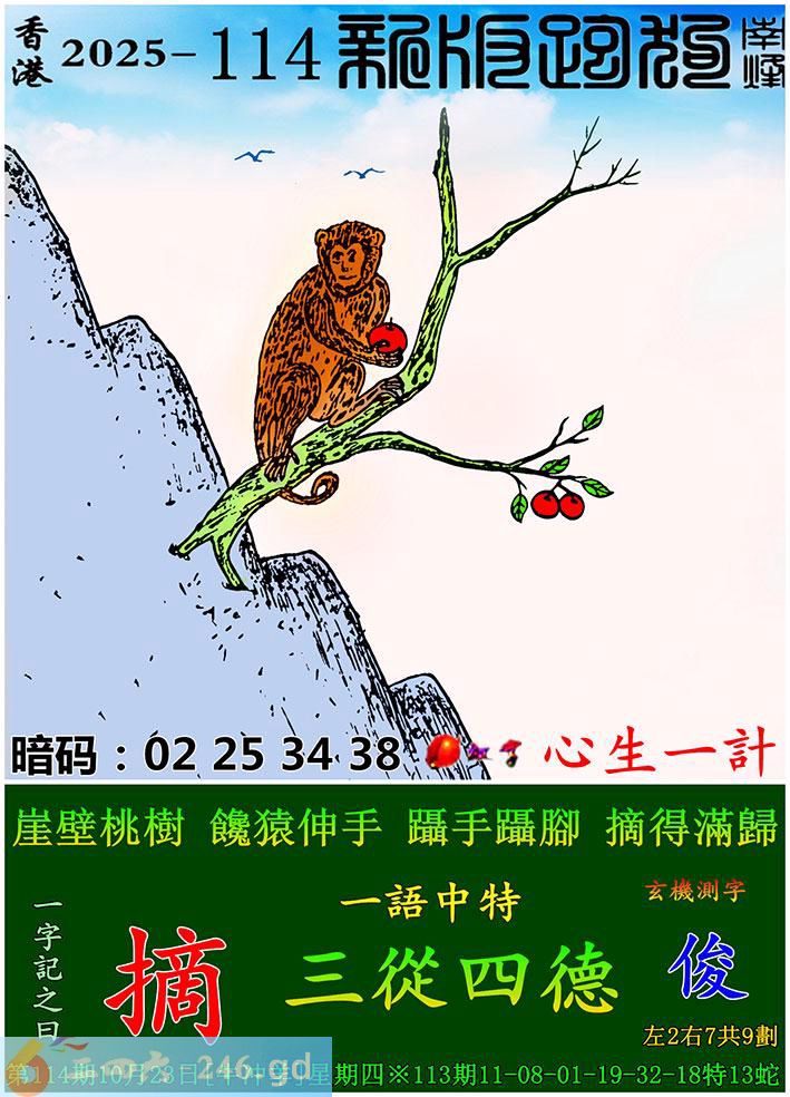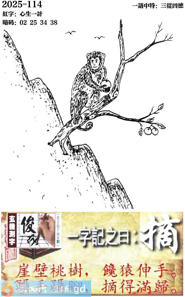 114期跑狗一字記之曰:【摘】 崖壁桃樹,饞猿伸手。 躡手躡腳,摘得滿歸。 玄機測字:《俊》 一語中特:三從四德