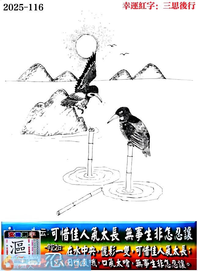 116期老版跑狗一字記之曰:【忍】 詩雲:可惜佳人氣太長,無事生非怎忍讓。 在水中央,儷影一雙,可惜佳人氣太長; 日哦夜哦,口氣太嗆,無事生非怎忍讓。 玄機測字:《漚》