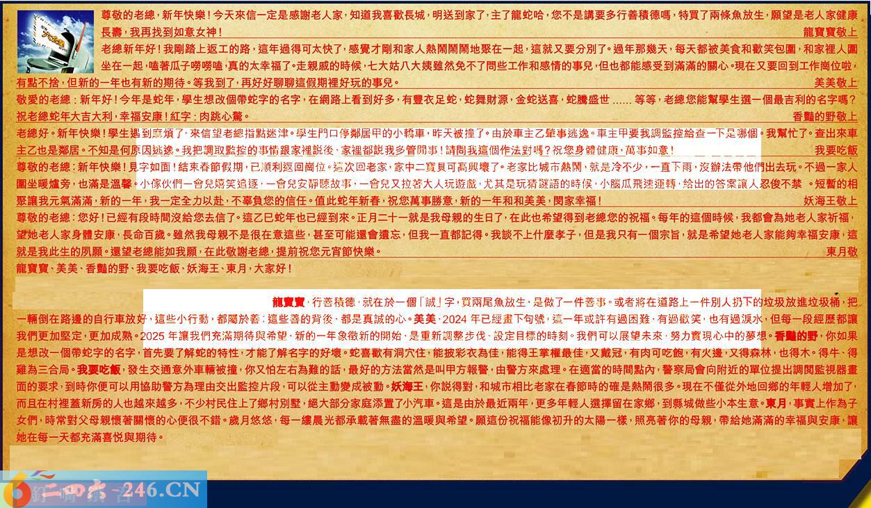 【3】.敬愛的老總:新年好!今年是蛇年,學生想改個帶蛇字的名字,在網路上看到好多,有豐衣足蛇,蛇舞財源,金蛇送喜,蛇騰盛世......等等,老總您能幫學生選一個最吉利的名字嗎?祝老總蛇年大吉大利,幸福安康!紅字:肉跳心驚。香豔的野敬上