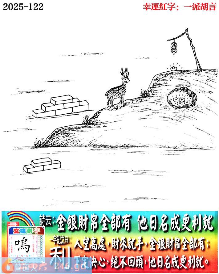 122期老版跑狗一字記之曰:【利】 詩雲:金銀財帛全部有,他日名成更利就。 人望高處,財來就手,金銀財帛全部有; 下定決心,絕不回頭,他日名成更利就。 玄機測字:《鳴》