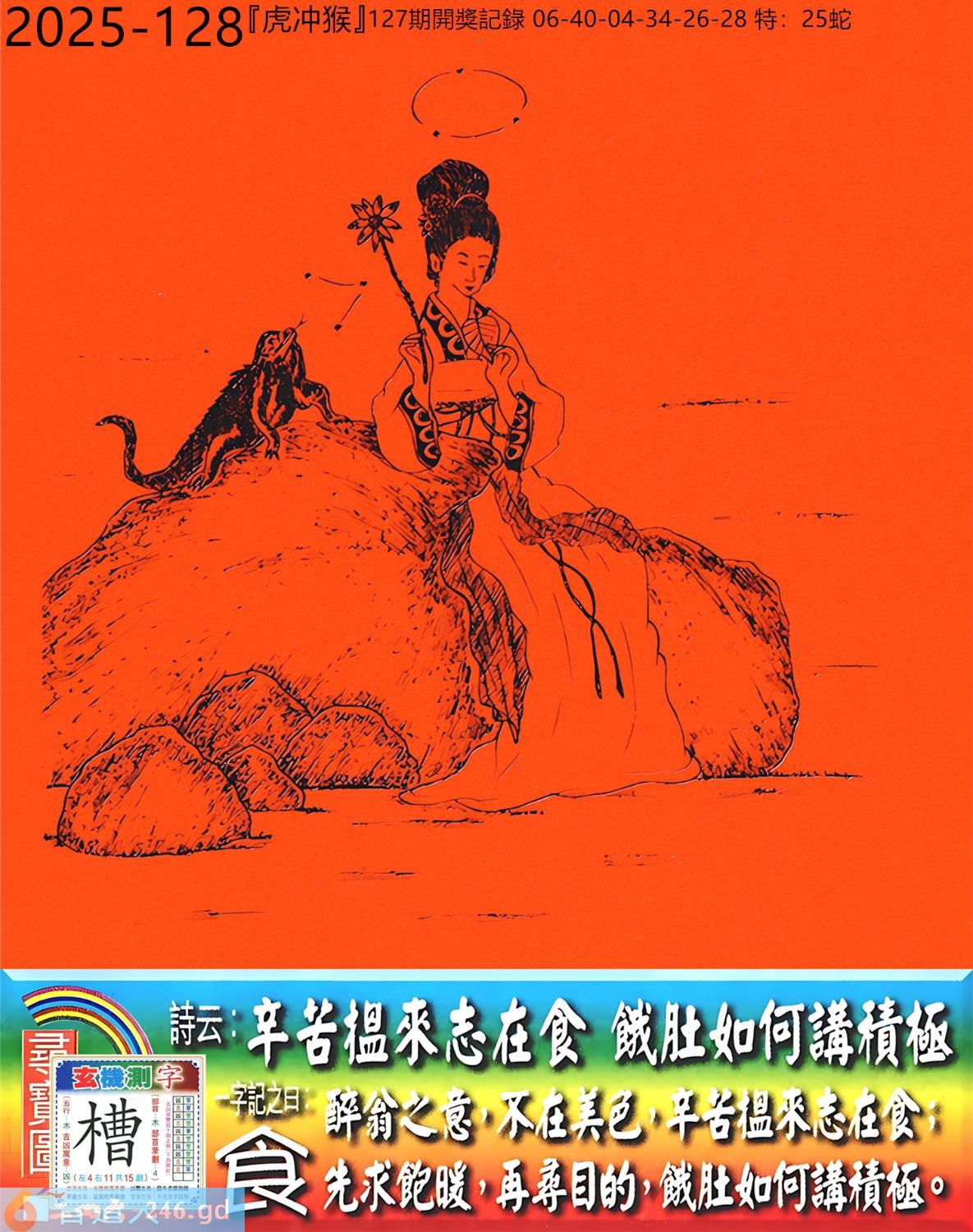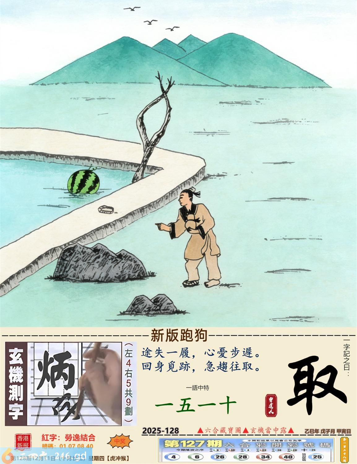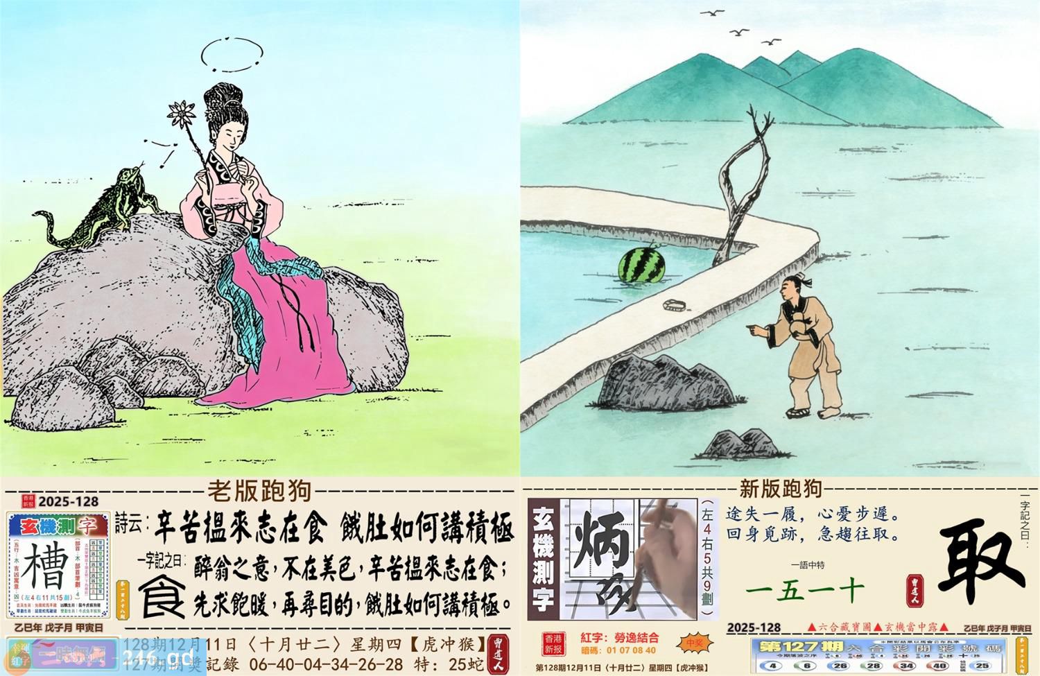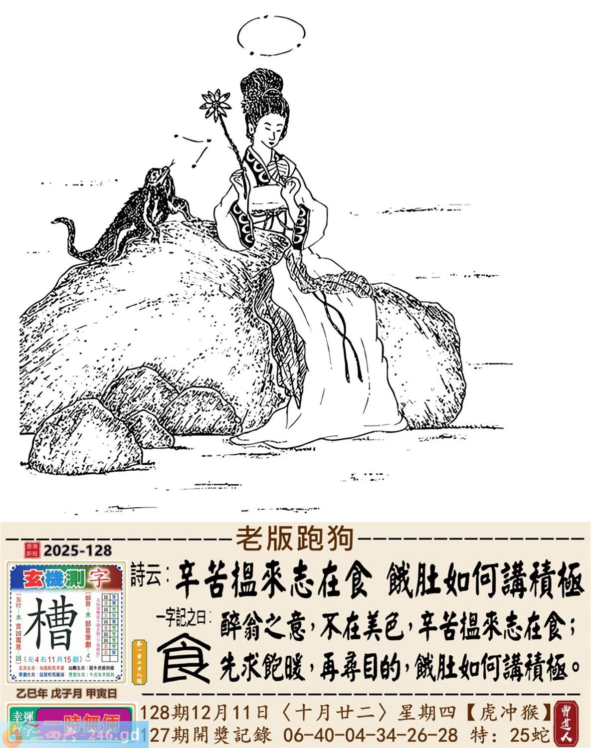 2025年12月11日128期侯(戊申)(大溪水) 128期:老版跑狗玄機一字記之曰:【食】 詩云:辛苦搵來志在食餓肚如何講積極 醉翁之意,不在美色,辛苦搵来志在食; 先求飽暖,再尋目的,餓肚如何講積極。 玄機測字:《槽》 密圖詩:月下五人在徘回 《記》:江湖武器十八件 特碼大小單雙句:昔日常夸八最好 今期必中:高順 128期:特碼歇后語 美丽而不遮体-----华而不实 128期正版四字梅花诗:添砖加瓦。 128期火车头:烧伤兔。诗:羊死猴伤,半岭天风一九三。 128期香港第一手欲钱料:低三下四? 128期曾道人说:“石头?” 128期另版四字梅花诗:山上放羊。 128期香港第一手欲钱料:欲钱看西游记第八回。 128期曾道人说:“女人三十生与死之间会想念些什么”? 128期:二字經:多事 128期:井中有特码 128期:智力金壤:红颜知己 128期:信箱紅字:【勞逸結合】 128期:【暗碼:01-07-08-40】 128期:一語中特:【一五一十】 發财玄機圖:温馴膽小潔白可愛圖中明羊紅綠 128期:藏寳圖 新:作意叁年醉月华 老:前山急雨过溪来 禁:狗禁:4尾玄機字《衰》 2025年128期【生活幽默】版 〖錢攒够了〗 某妻,刁蠻狡猾。夫:“我想納妾。” 妻:“你這麽窮,哪有錢買妾?你若有錢,我可以答應。” 于是丈夫拼命攒私房錢,又找朋友借了點,拿回家告訴妻子:“錢攢够了,你看!" 妻子搶過錢來,納入袖中,盈盈下拜:“我情願做小,這錢正好買了奴家。”