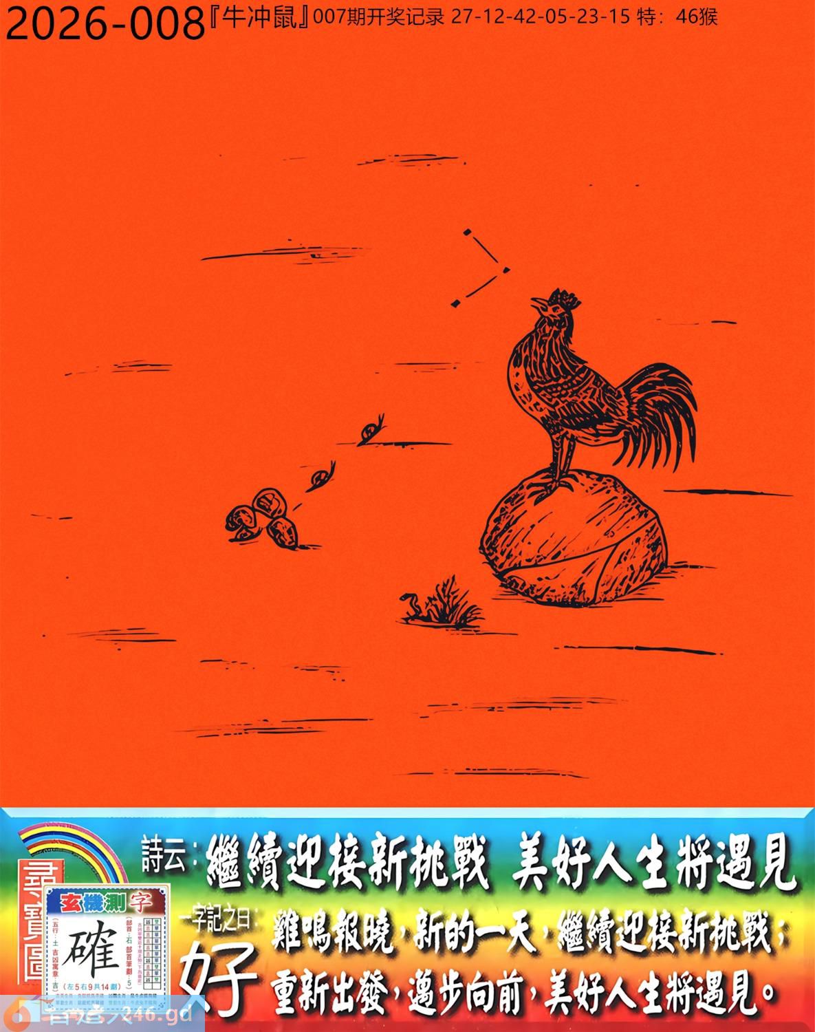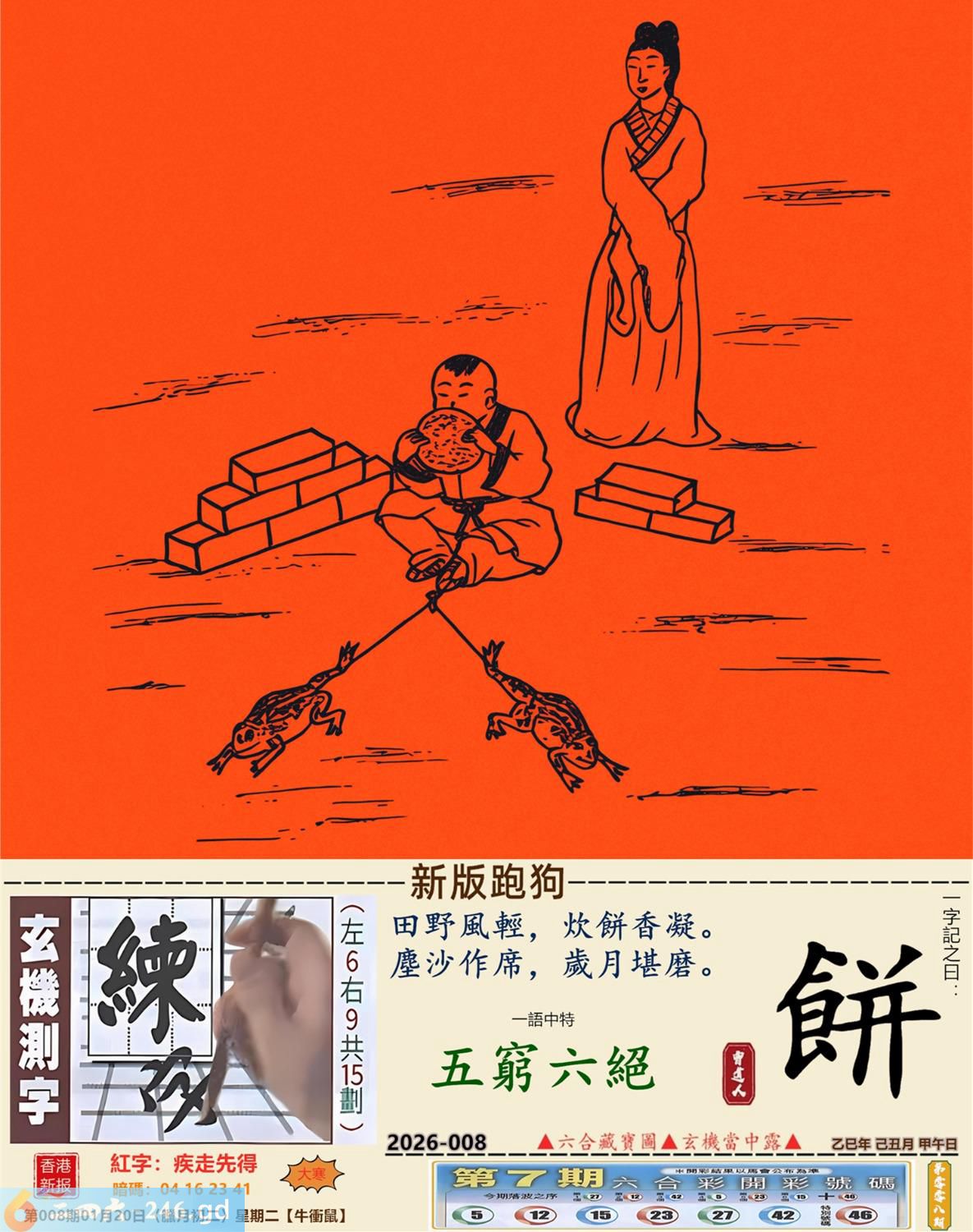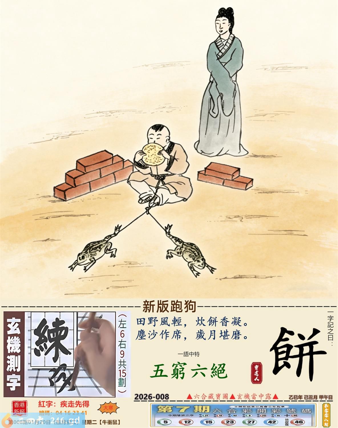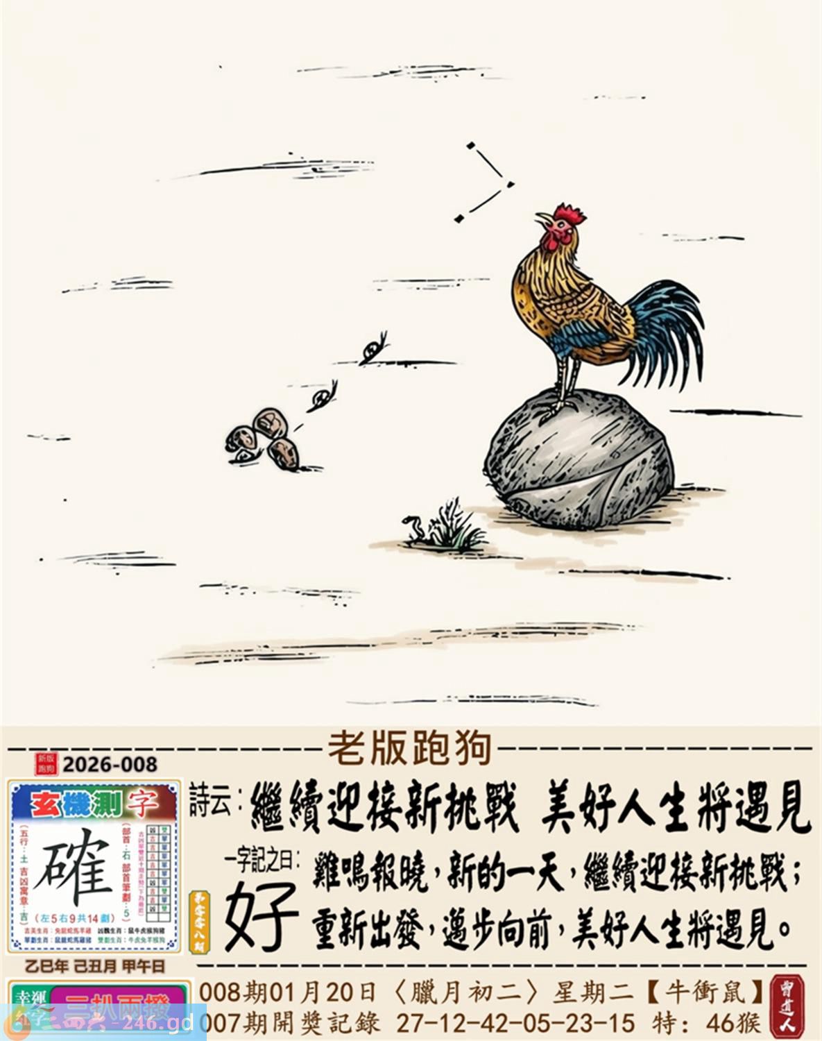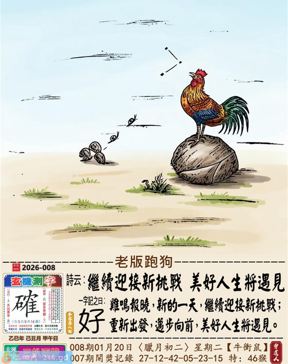 2026年1月20日008期鼠(戊子)(沙中金) 008期:老版跑狗玄機一字記之曰:【好】 詩云:繼續迎接新挑戰美好人生將遇見 雞鳴報曉,新的一天,繼續迎接新挑戰; 重新出發,邁步向前,美好人生將遇見。 玄機測字:《確》 密圖詩:小小意思買二十 《記》:大紅喜字我來剪 特碼大小單雙句:邁開雙大步走 今期必中:孫尚香 008期:特碼歇后語 豹子吃马鹿-----好大的胃口 008期正版四字梅花诗:背水一战。 008期火车头:烧伤鸡。诗:猴死猪伤,一落千咱万家屡。 008期香港第一手欲钱料:大开绿灯? 008期曾道人说:“再三再四?” 008期另版四字梅花诗:百年大计。 008期香港第一手欲钱料:欲钱看温柔的动物。 008期曾道人说:“为什么成功的男人事业为重”? 008期:二字經:休息 008期:今天是特码 008期:智力金壤;阳春白雪 008期:信箱紅字:【疾走先得】 008期:【暗碼:04-16-23-41】 008期:一語中特:【五窮六絕】 發財玄機圖:伸縮性强千姿百態圖中明蛇紅藍 008期:藏寳圖 新:清晓起来无个事 老:自说孤舟寒水畔 禁:牛禁:4尾玄機字《邦》 2026年008期【生活幽默】版 〖優待〗 機場登機櫃臺前,一位先生急匆匆擠上前問:"我是搭乘八點三十分的航班飛北京的,飛機起飛了没有?" 服務員答:"對不起,先生,飛機已經起飛了。" "可我是坐頭等艙的,就没有優待嗎?"這位先生還不死心。 機場服務員:"没有,先生。頭等艙和經濟艙是一起飛的。"