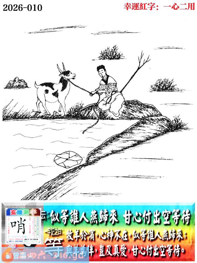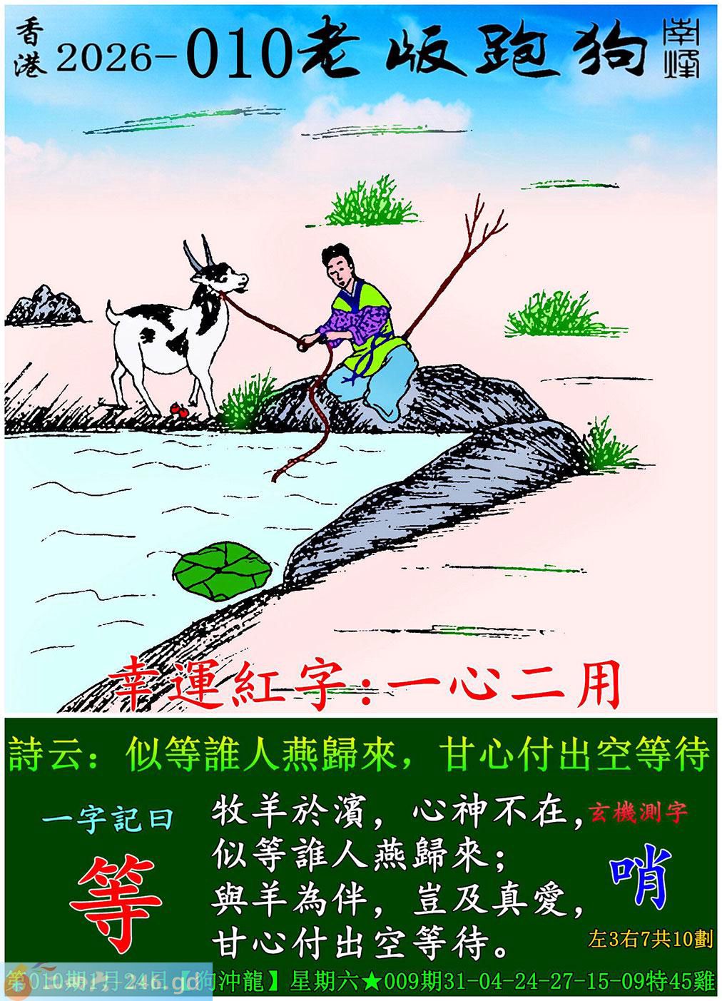 010期老版跑狗一字記之曰:【等】 詩雲:似等誰人燕歸來,甘心付出空等待。 牧羊於濱,心神不在,似等誰人燕歸來; 與羊為伴,豈及真愛,甘心付出空等待。 玄機測字:《哨》
