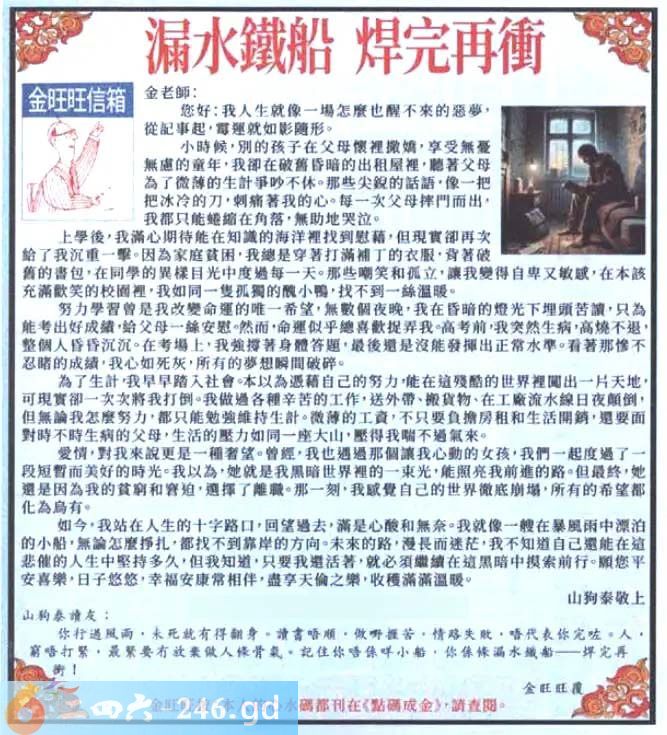 2025010期010期:金旺旺信箱彩民推荐→→《漏水鐵船 焊完再衝》