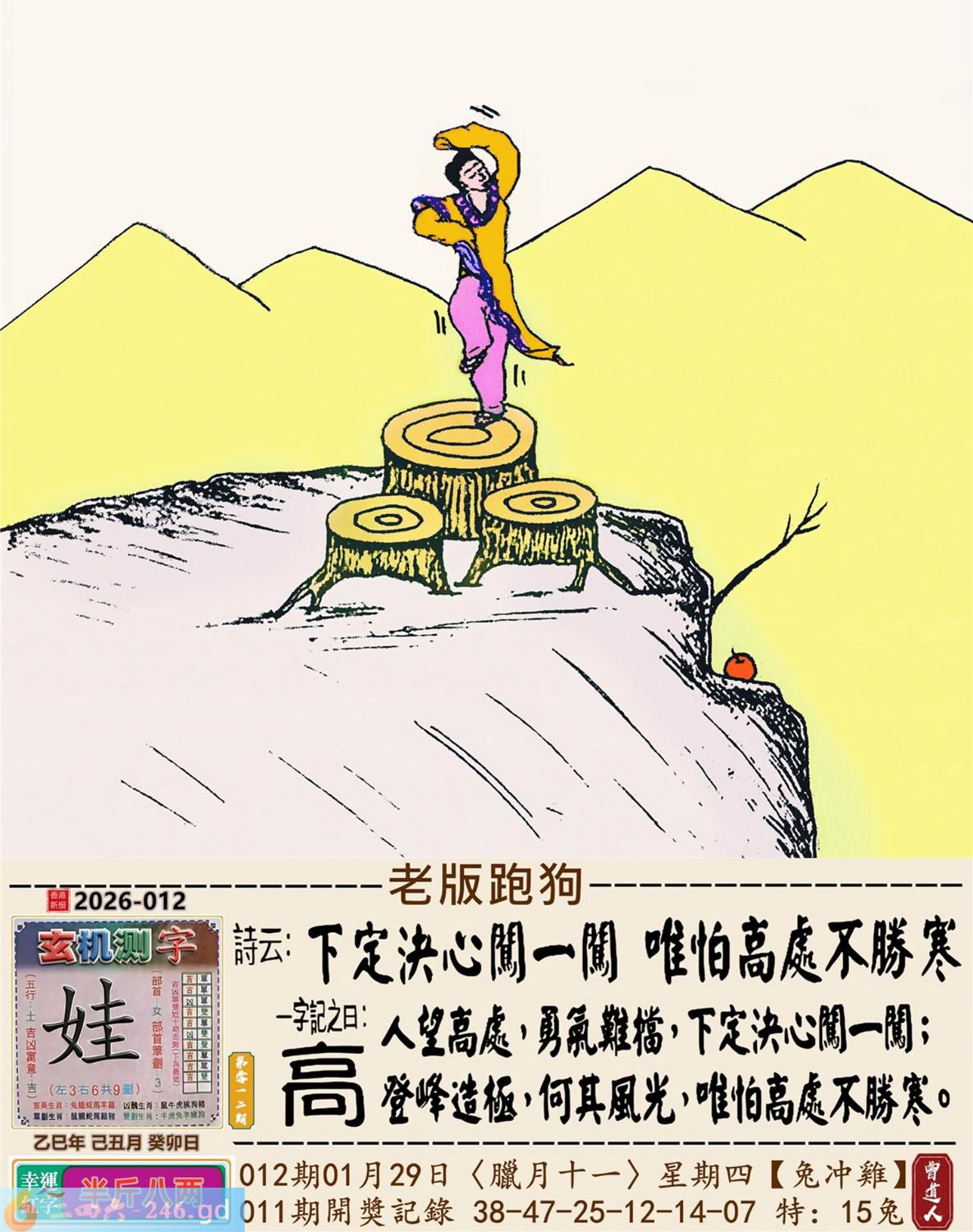 本帖最后由小歪于2026-1-2908:41编辑 2026年1月29日012期鸡(丁酉)(金箔金) 012期:老版跑狗玄機一字記之曰:【高】 詩云:下定決心闖一闖唯怕高處不勝寒 人望高處,勇氣難檔,下定決心闖一闖; 登峰造極,何其風光,唯怕高處不勝寒。 玄機測字:《娃》 密圖詩:竹藍打水一場空 《記》:八仙賀喜到門前 特碼大小單雙句:天天去市場買菜 今期必中:馬超 012期:特碼歇后語 祖奶奶的花鞋-----老式样 012期正版四字梅花诗:三天打鱼。 012期火车头:烧伤马。诗:马死兔伤,二九出特今期来。 012期香港第一手欲钱料:日本? 012期曾道人说:“三个?” 012期另版四字梅花诗:美丽神话。 012期香港第一手欲钱料:欲钱找2005年最后一期的开奖记录。 012期曾道人说:“恭贺大陆各位彩民在2005年的最后一期发大财”? 012期:二字經:多情 012期:二流子是特码 012期:智力金壤;左道旁门 012期:信箱紅字:【一錘定音】 012期:【暗碼:13-28-34-41】 012期:一語中特:【三頭六臂】 發財玄機圖:聞嗅探索警覺性強圖中明鼠紅藍 012期:藏寳圖 新:家在画桥堤下住 老:古来惟有酒偏香 禁:猴禁:9尾玄機字《读》 2026年012期【生活幽默】版 〖一個專養乳牛的牧場〗 一個專養乳牛的牧場,爲了維持牧場内牛衹的数量,在母牛群中放養了一衹公的乳牛。但是時間久了,這衹公牛也老了,開始有點力不從心,于是牧場的主人又買了一衹新的公牛來擔任維持牛衹數量的工作。至于那衹老公牛,由于過去数年來,它没有功勞也有苦勞,所以主人還是繼續放它在母牛群裹逍遥。有一天,主人去巡視牧場,看見老公牛氣喘嘘地趴在草地上。牧場主人走近説:你年紀大了就收斂一點,不要作這多。老公牛一臉無辜的説:你難道不能告訴那衹新來的,我不是母牛!