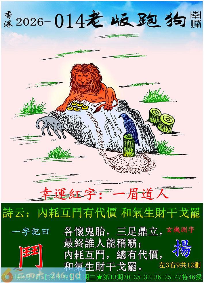 014期老版跑狗一字記之曰:【鬥】 詩雲:內耗互鬥有代價,和氣生財干戈罷。 各懷鬼胎,三足鼎立,最終誰人能稱霸; 內耗互鬥,總有代價,和氣生財干戈罷。 玄機測字:《揚》