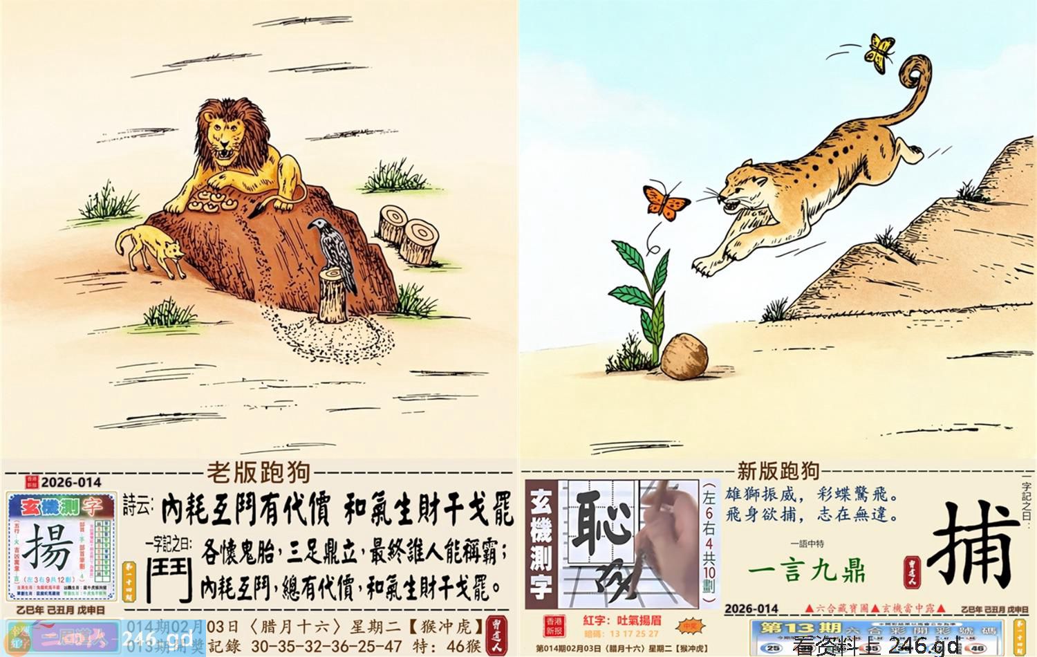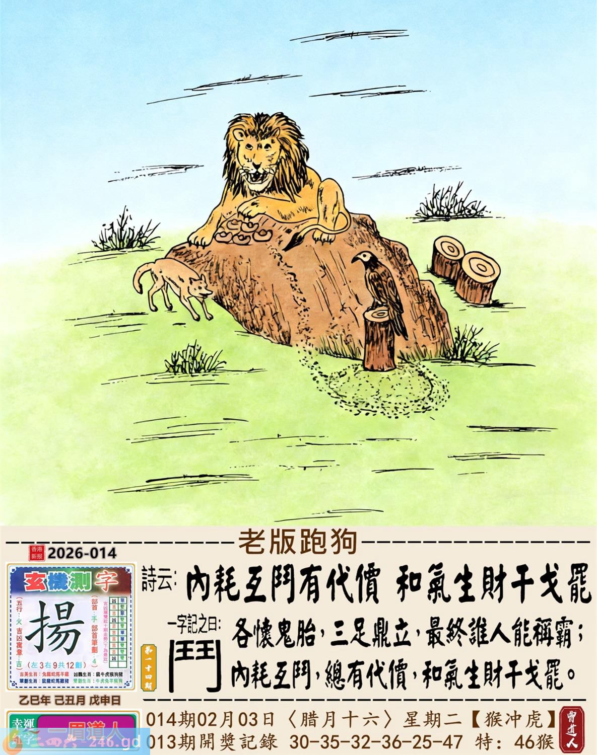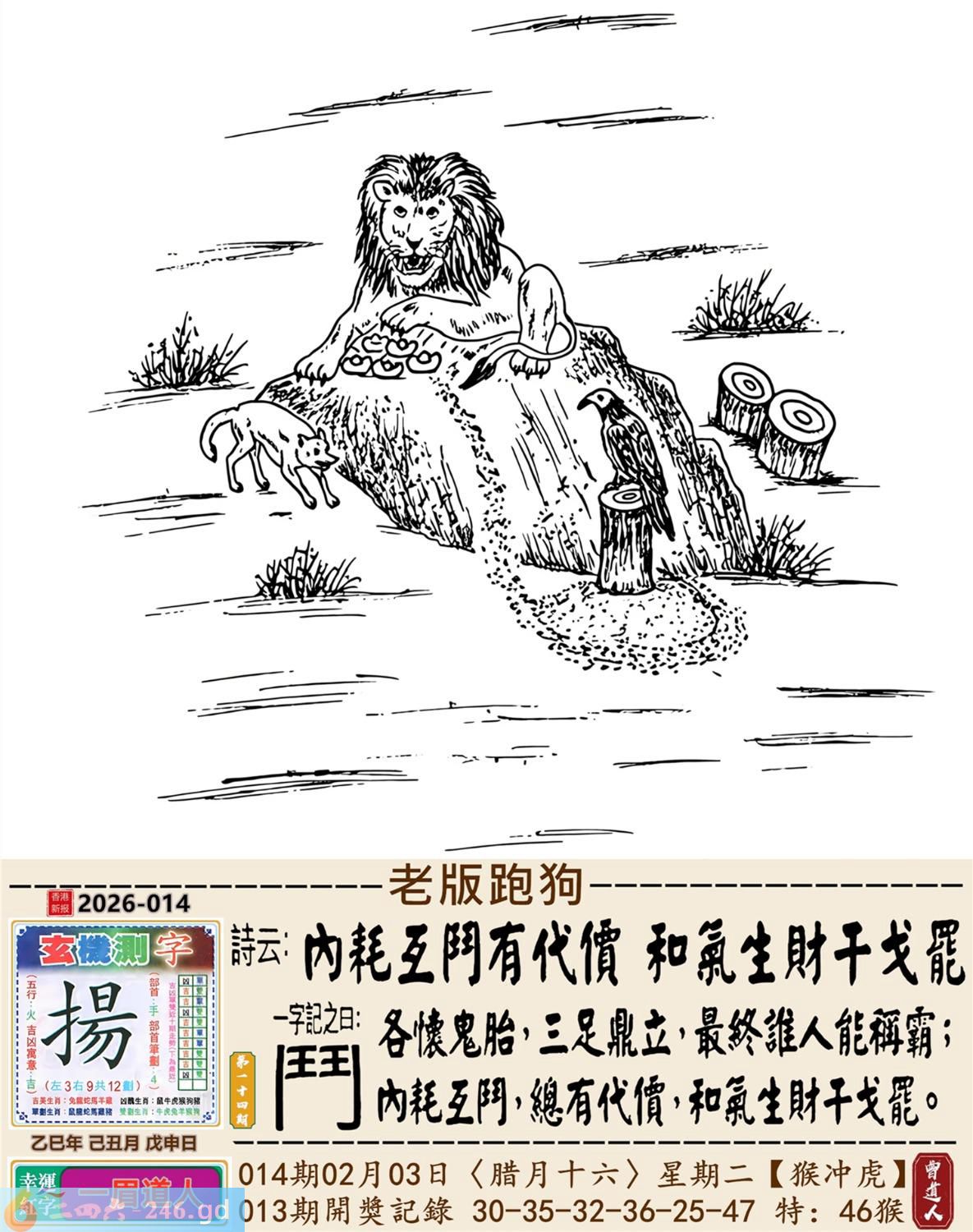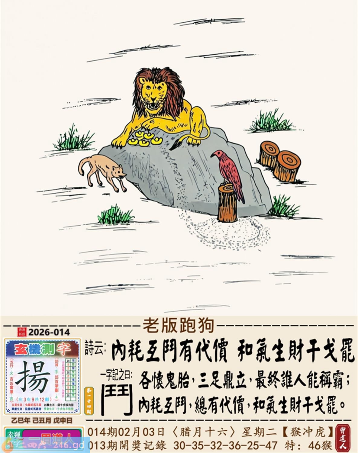 2026年2月3日014期虎(壬寅)(大驿土) 014期:老版跑狗玄機一字記之曰:【鬥】 詩云:內耗互鬥有代價和氣生財干戈罷 各懷鬼胎,三足鼎立,最終誰人能稱霸; 內耗互鬥,總有代價,和氣生財干戈罷。 玄機測字:《揚》 密圖詩:點將臺上閱三軍 《記》:三五必須多留意 特碼大小單雙句:折花送佳人 今期必中:劉備 014期:特碼歇后語 醉汉上街-----东倒西歪 014期正版四字梅花诗:无处可逃。 014期火车头:烧伤鸡。诗:猴死狗伤,斑竹初成三妃庙。 014期香港第一手欲钱料:龙。 014期曾道人说:“土?” 014期另版四字梅花诗:鸡啄狗屋。 014期香港第一手欲钱料:欲钱去看温柔凶暴的动物。 014期曾道人说:“为什么很多女孩子比较喜欢酷的少年”? 014期:二字經:酸痛 014期:小鸡鸡是特码 014期:智力金壤; 014期:信箱紅字:【吐氣揚眉】 014期:【暗碼:13-17-25-27】 014期:一語中特:【一言九鼎】 發財玄機圖:積穀防飢儲備充足圖中明兔紅藍 014期:藏寳圖 新:但觉山光侵酒绿 老:溪涧岂能留得住 禁:牛禁:3尾玄機字《扈》 2026年014期【生活幽默】版 〖利息〗 丈夫:爲什你媽媽每年過生日,咱倆都要給她四百元錢呢? 妻子:那是應該的,我媽把她的"千金"給了你,這四百元是每年的利息。 丈夫:那我媽也把我這個"二百五"給了你呢,每年你多少也應該給點利息吧? 妻子:你搞錯了,我們家是存款方,而你們家是貸款方。