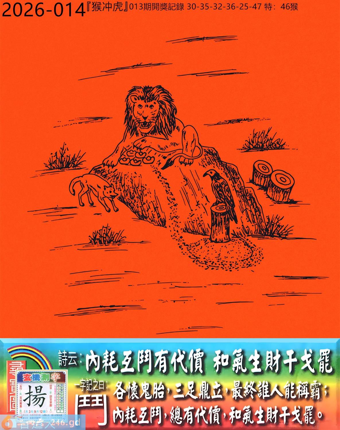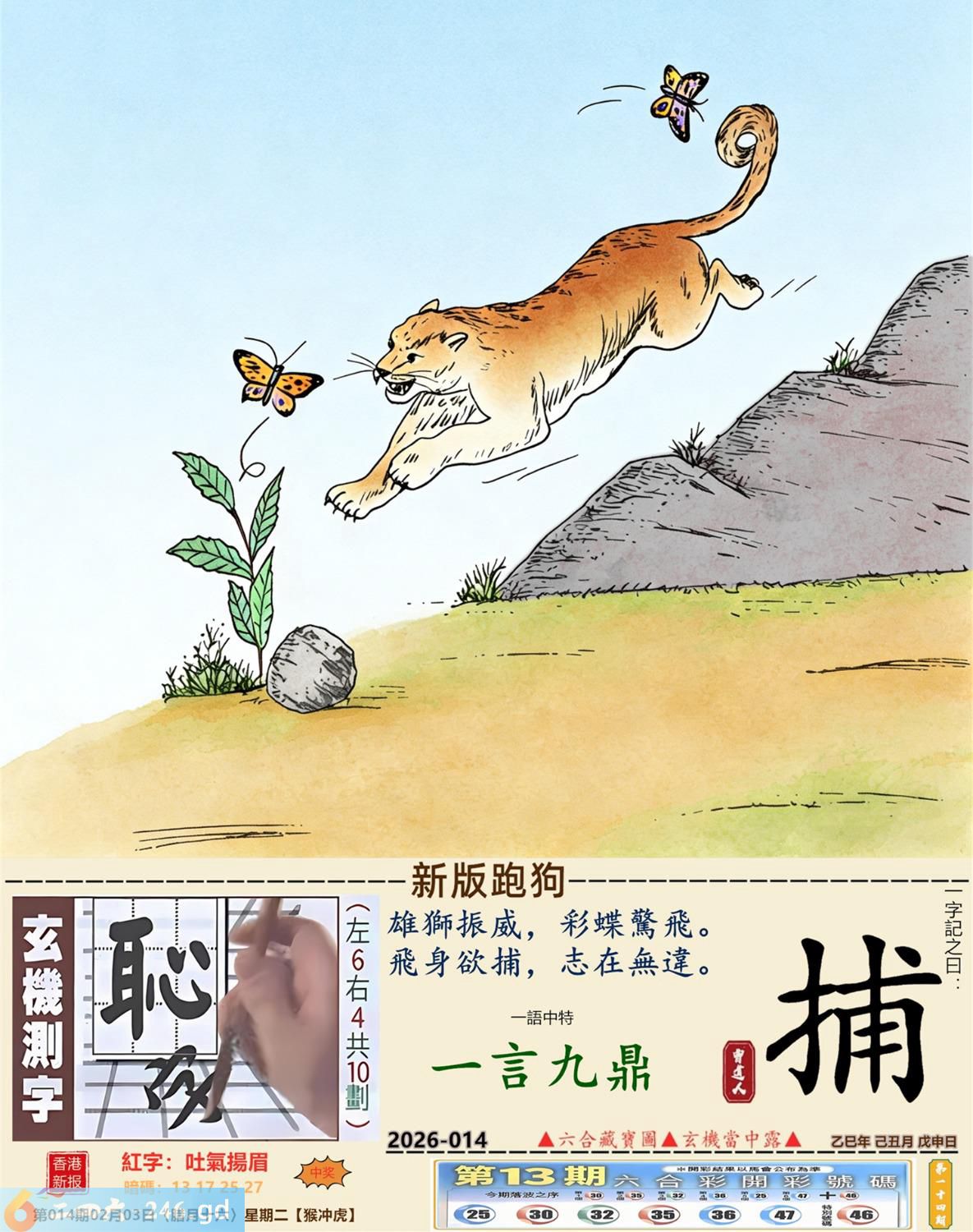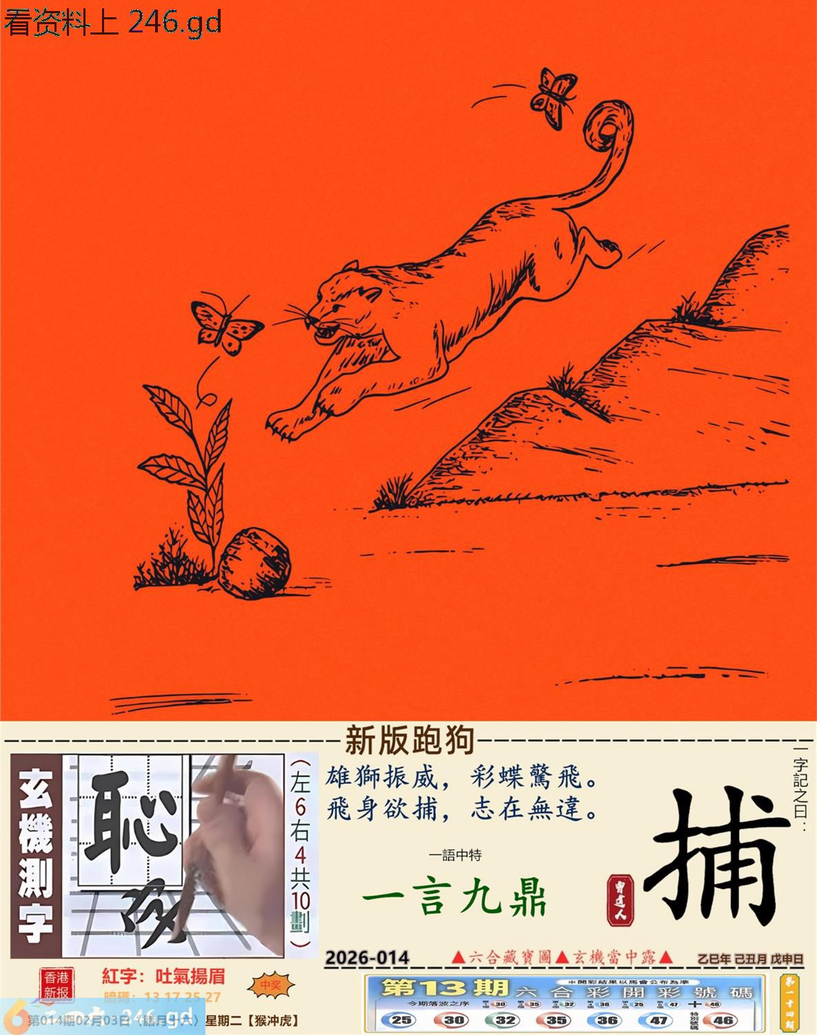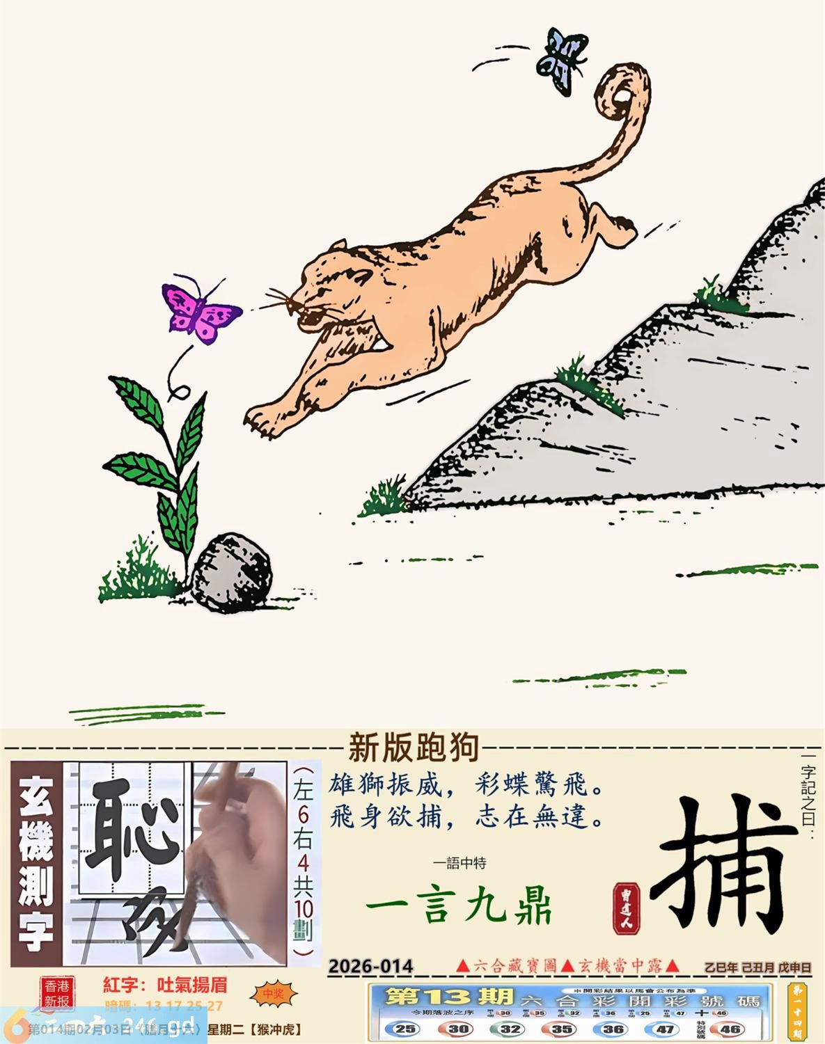 2026年2月3日014期虎(壬寅)(大驿土) 014期:老版跑狗玄機一字記之曰:【鬥】 詩云:內耗互鬥有代價和氣生財干戈罷 各懷鬼胎,三足鼎立,最終誰人能稱霸; 內耗互鬥,總有代價,和氣生財干戈罷。 玄機測字:《揚》 密圖詩:點將臺上閱三軍 《記》:三五必須多留意 特碼大小單雙句:折花送佳人 今期必中:劉備 014期:特碼歇后語 醉汉上街-----东倒西歪 014期正版四字梅花诗:无处可逃。 014期火车头:烧伤鸡。诗:猴死狗伤,斑竹初成三妃庙。 014期香港第一手欲钱料:龙。 014期曾道人说:“土?” 014期另版四字梅花诗:鸡啄狗屋。 014期香港第一手欲钱料:欲钱去看温柔凶暴的动物。 014期曾道人说:“为什么很多女孩子比较喜欢酷的少年”? 014期:二字經:酸痛 014期:小鸡鸡是特码 014期:智力金壤; 014期:信箱紅字:【吐氣揚眉】 014期:【暗碼:13-17-25-27】 014期:一語中特:【一言九鼎】 發財玄機圖:積穀防飢儲備充足圖中明兔紅藍 014期:藏寳圖 新:但觉山光侵酒绿 老:溪涧岂能留得住 禁:牛禁:3尾玄機字《扈》 2026年014期【生活幽默】版 〖利息〗 丈夫:爲什你媽媽每年過生日,咱倆都要給她四百元錢呢? 妻子:那是應該的,我媽把她的"千金"給了你,這四百元是每年的利息。 丈夫:那我媽也把我這個"二百五"給了你呢,每年你多少也應該給點利息吧? 妻子:你搞錯了,我們家是存款方,而你們家是貸款方。