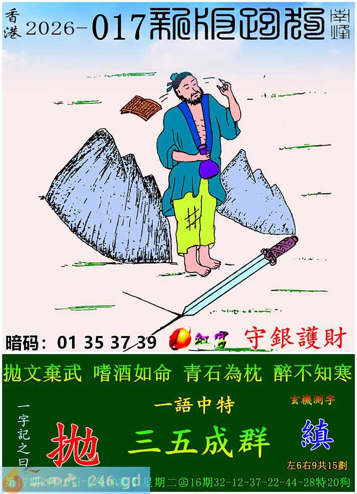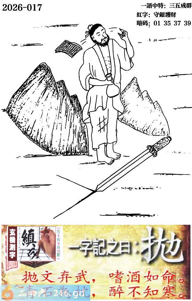 017期跑狗一字記之曰:【拋】 拋文棄武,嗜酒如命。 青石為枕,醉不知寒。 玄機測字:《縝》 一語中特:三五成群