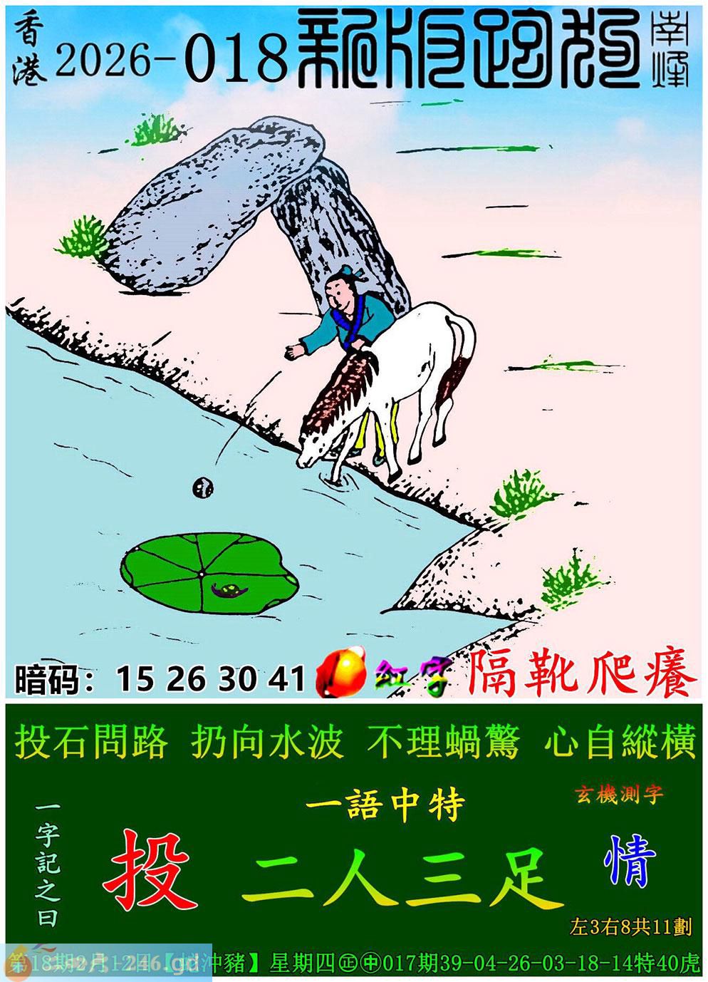 018期跑狗一字記之曰:【投】 投石問路。扔向水波。 不理蝸驚,心自縱橫。 玄機測字:《情》 一語中特:二人三足