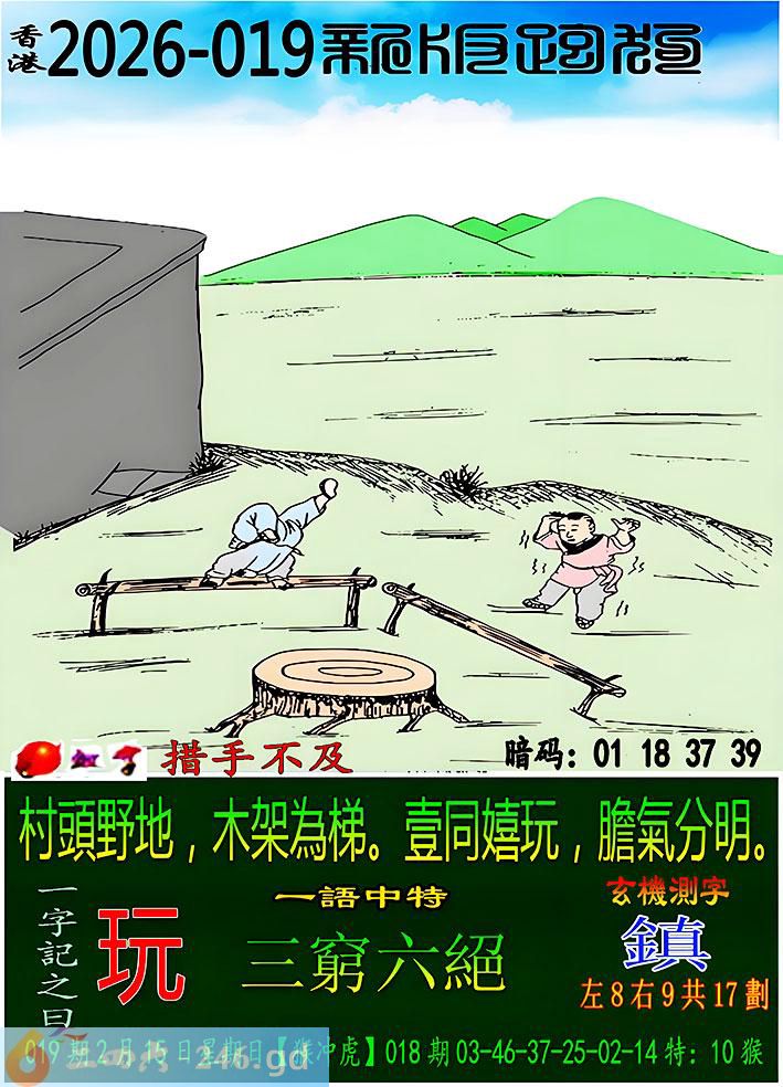 019期跑狗一字記之曰:【玩】 村頭野地,木架為梯。 壹同嬉玩,膽氣分明。