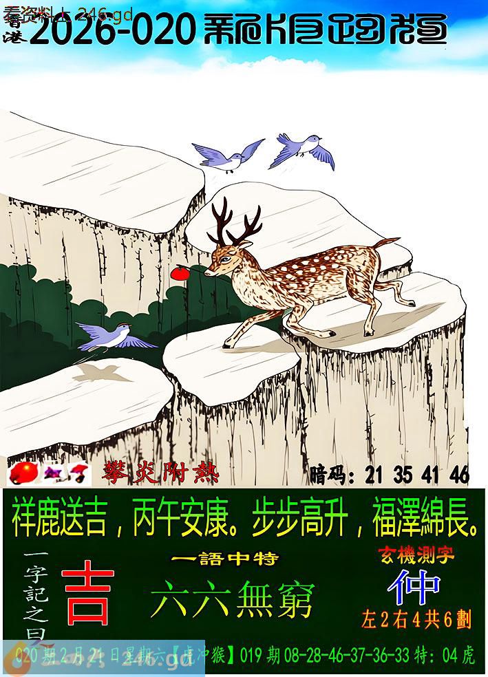 2026年2月21日020期侯(庚申(炉中火) 020期:老版跑狗玄機一字記之曰:【新】 詩云:新年有勢又有財壽如南山福如海 靈駒報喜,恭喜發財,新年有勢又有財; 捷報頻傳,金銀滿載,壽如南山福如海。 玄機測字:《杜》 密圖詩:一男一女相伴隨 《記》:一左一右都是二 特碼大小單雙句:三心二意相互應 今期必中:貂禪 020期:特碼歇后語 河里捉王八-----(捉)作弊(鳖) 020期四字梅花诗:言不由衷。 020期火车头:烧伤猪。诗:龙死马伤,三六一二比短长。 020期香港第一手欲钱料:蛇。 020期曾道人说:“年月日?” 020期另版四字梅花诗:三番五次。 020期香港第一手欲钱料:欲钱看一九九八年第一百三十期。 020期曾道人说:“为什么电视没冇天线还可以正常播放”? 020期:二字經:人間 020期:夏至是特码 020期:智力金壤;杏雨梨云 020期:信箱紅字:【攀炎附熱】 020期:【暗碼:21-35-41-46】 020期:一語中特:【六六無窮】 發財玄機圖:變化多端窗外風景圖中明龍藍綠 020期:藏寳圖 新:可能同读远游无 老:坐客无毡醉不知 禁:猴禁:7尾玄機字《套》 2026年020期【生活幽默】版 〖快樂的寡婦〗 劇院開戲前,一群美國中老年婦女嘻哈聊天,好不熱鬧。 其中一位覺得同伴太吵,有點過意下去,便對身旁的布朗先生道歉:"對不起,我們實在太快樂了。你知道嗎?我認識她們好幾十年了,她們的先生都去世了。他們自稱快樂的寡婦,每年自組出外旅游玩一玩。我一直很想加入這個團體,可是,一直至今年春天,我才具備入會的資格。"