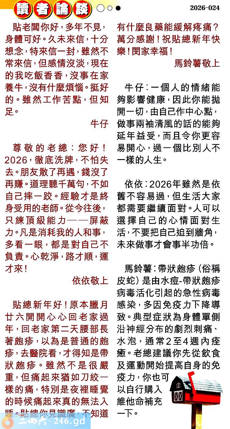 〖依依〗:2026年雖然是依善不容易過,但生活大家都需要繼續面對。人可以選擇自己的心情面對生活,不要把自己迫到牆角,未來做事才會事半功倍。
