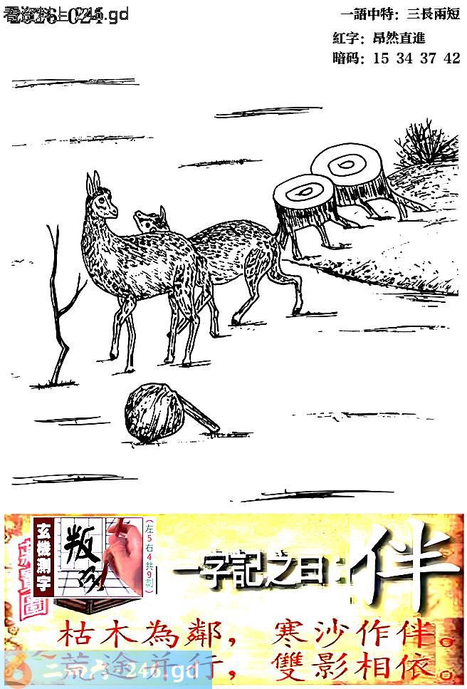 024期跑狗一字記之曰:【伴】 枯木為鄰,寒沙作伴。 荒途並行,雙影相依。 玄機測字:《叛》 一語中特:三長兩短