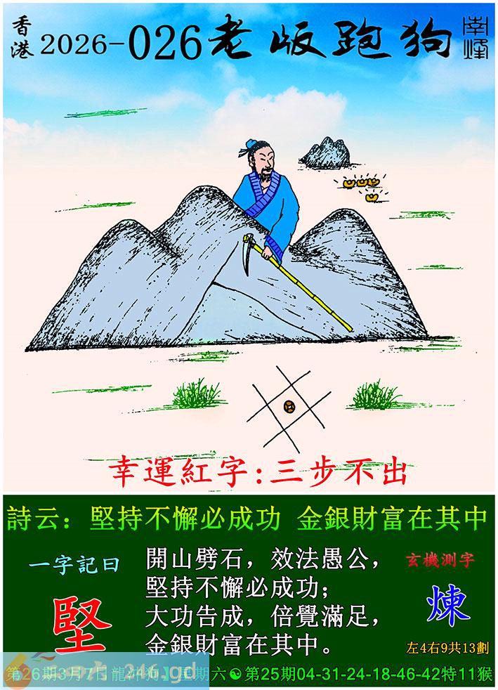 026期老版跑狗一字記之曰:【堅】 詩雲:堅持不懈必成功,金銀財富在其中。