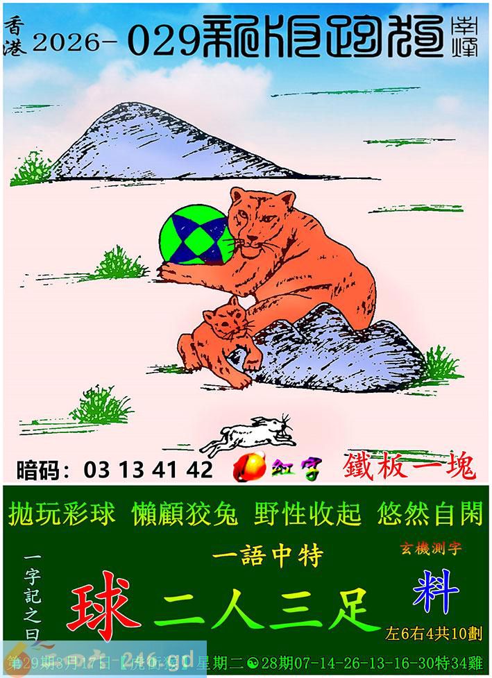 029期跑狗一字記之曰:【球】 拋玩彩球,懶顧狡兔。 野性收起,悠然自閑。 玄機測字:《料》 一語中特:二人三足