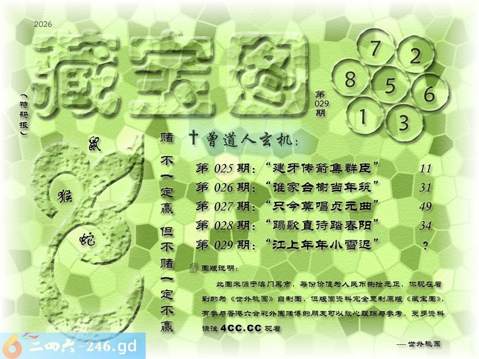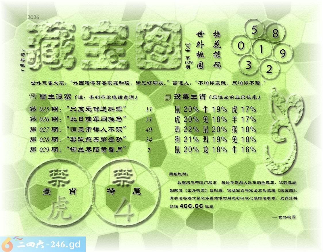 029期藏寶圖 新:江上年年小雪迟 老:柳丝巷陌黄昏月 禁:虎禁:4尾玄機字:《匪》