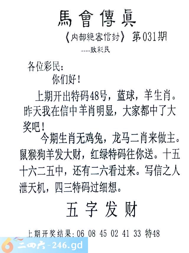 031期:首发推荐:≮馬會傳眞≯→(香港正版)