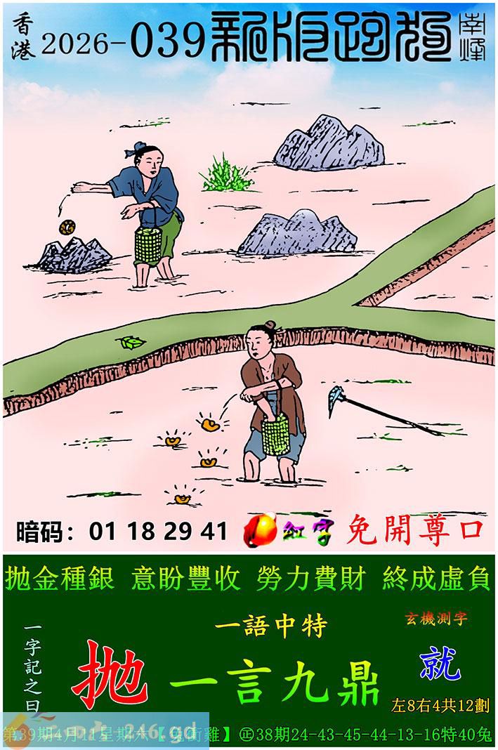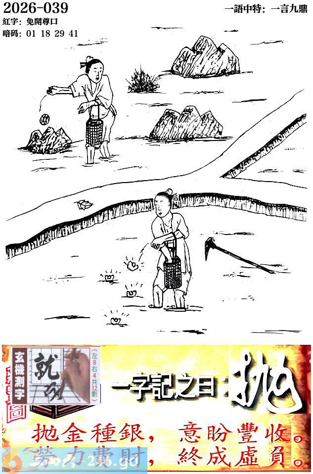 039期跑狗一字記之曰:【就】 抛金種銀,意盼豐收。 勞力費財,終成虛負。 玄機測字:《抛》 一語中特:一言九鼎