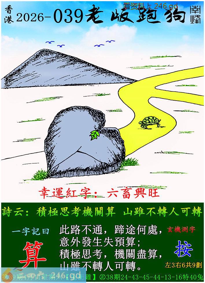039期老版跑狗一字記之曰:【算】 詩雲:積極思考機關算,山雖不轉人可轉。