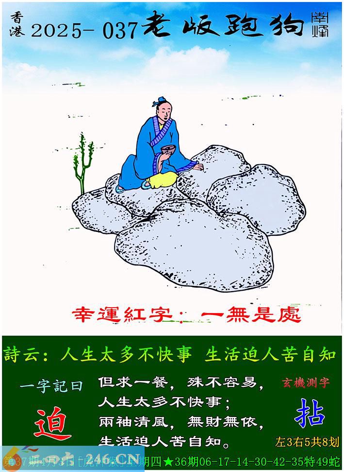 037期老版跑狗一字記之曰:【迫】 詩雲:人生太多不快事,生活迫人苦自知。