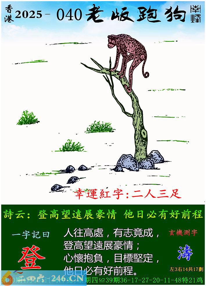 040期老版跑狗一字記之曰:【登】 詩雲:登高望遠展豪情,他日必有好前程。