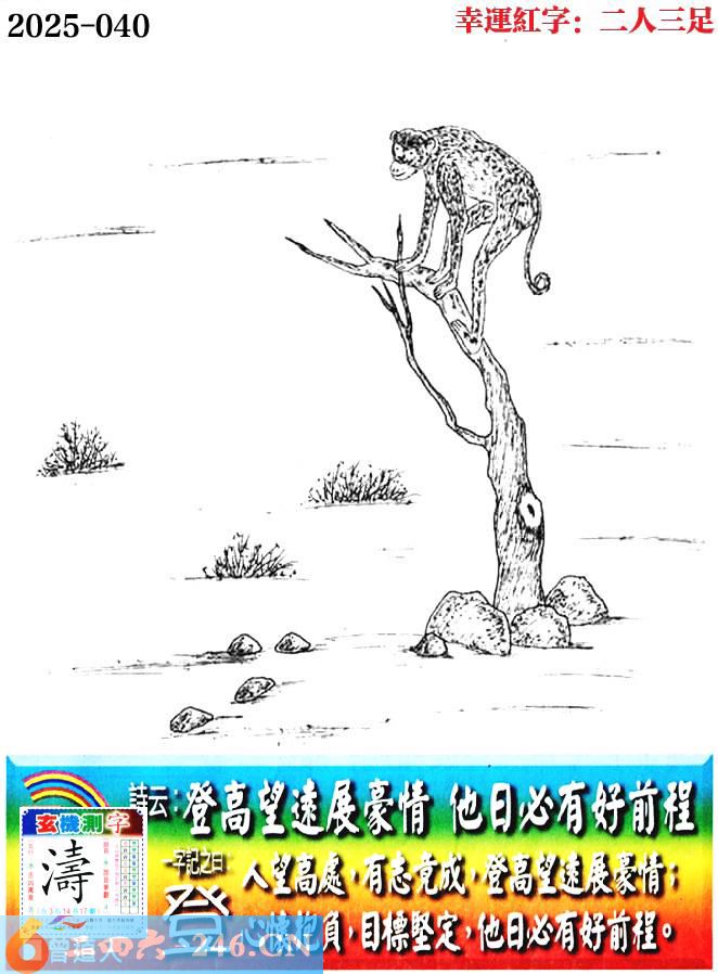 040期老版跑狗一字記之曰:【登】 詩雲:登高望遠展豪情,他日必有好前程。 人往高處,有志竟成,登高望遠展豪情; 心懷抱負,目標堅定,他日必有好前程。 玄機測字:《濤》