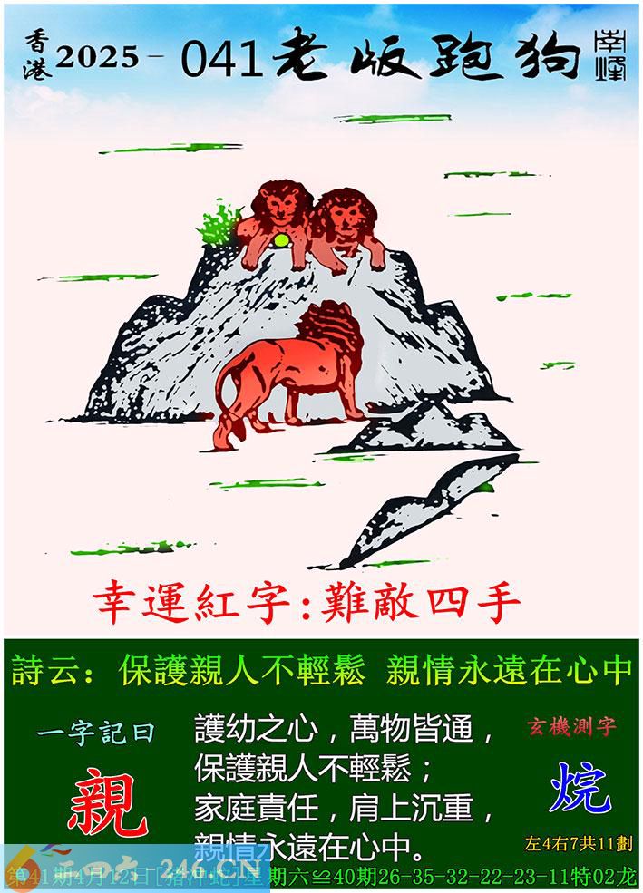041期老版跑狗一字記之曰:【親】 詩雲:保護親人不輕鬆,親情永遠在心中。